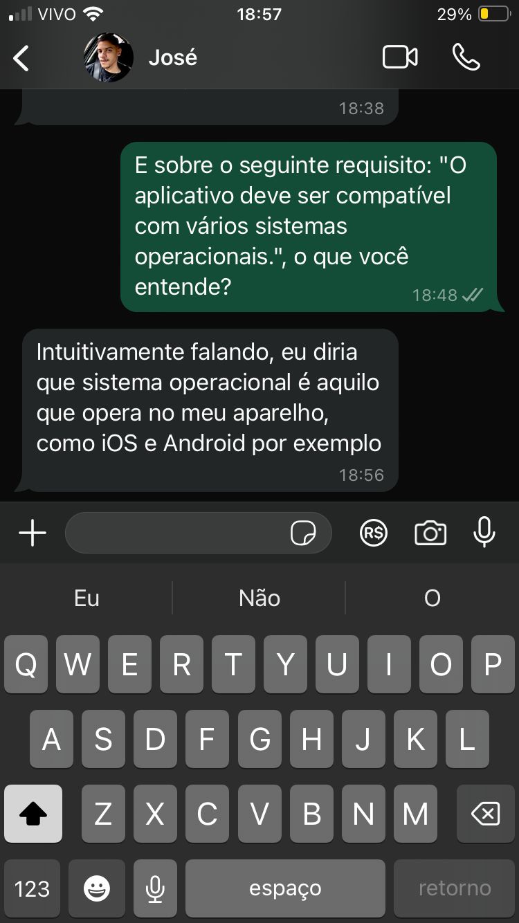 | R32 | O aplicativo deve ser compatível com vários sistemas operacionais | O sistema deve ser compatível com os sistemas operacionais IOS e Android | Conversa com José |