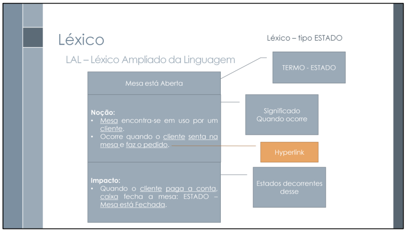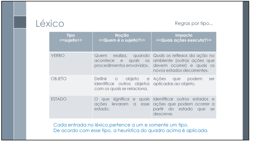 | 05 | Os tipos de léxicos (objeto, verbo, estado) estão devidamente identificados e diferenciados? | SERRANO, p. 17 | Sim |